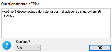 No exemplo acima, a cada 10 minutos será realizada uma verificação do tempo que o usuário está sem utilizar o sistema. Se o usuário estiver a mais de 30 minutos, será exibida a seguinte mensagem de aviso: